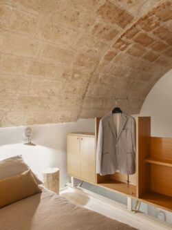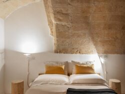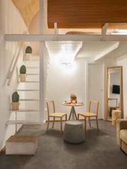 Posta a piano terra ha la volta in tufo a vista ed è soppalcata in legno bianco; il candore degli spazi e degli arredi è impreziosito dai colori caldi del divano e delle sedie in un’atmosfera dinamica e al tempo stesso esclusiva.